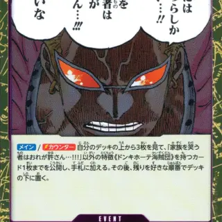 テキスト:【ドン!!×1】【アタック時】ドン!!-1(自分の場のドン!!を指定の数ドン!!デッキに戻すことができる):相手のコスト1以下のキャラ1枚までを、KOする。