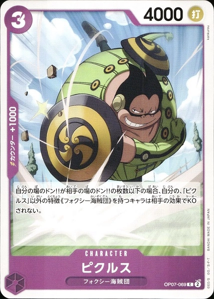 テキスト:自分の場のドン!!が相手の場のドン!!の枚数以下の場合、自分の、「ピクルス」以外の特徴《フォクシー海賊団》を持つキャラは相手の効果でKOされない。