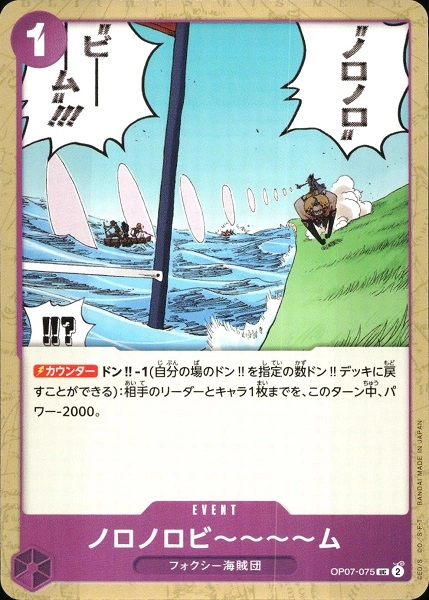 テキスト:【カウンター】ドン!!-1(自分の場のドン!!を指定の数ドン!!デッキに戻すことができる):相手のリーダーとキャラ1枚までを、このターン中、パワー-2000。