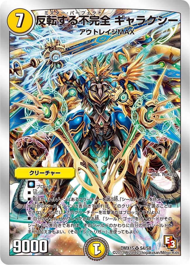 ブロッカーW・ブレイカー相手がバトルゾーンにあるクリーチャーを選ぶ時、「シールド・ゴー」を持つカードが自分のシールドゾーンに表向きであれば、このクリーチャーを選ぶことはできない。(ただし、このクリーチャーを攻撃またはブロックしてもよい)自分のシールドがブレイクされる時、「シールド・ゴー」を持つカードがそのシールドに表向きであれば、そのシールドのかわりに自分の他のシールドを手札に加えてもよい。(その「S・トリガー」を使ってもよい)