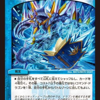 S・トリガー(この呪文をシールドゾーンから手札に加える時、コストを支払わずにすぐ唱えてもよい)バトルゾーンにある相手の、タップされていないクリーチャーを1体選び、持ち主のマナゾーンに置く。クリーチャーを1体、自分のマナゾーンから手札に戻してもよい。