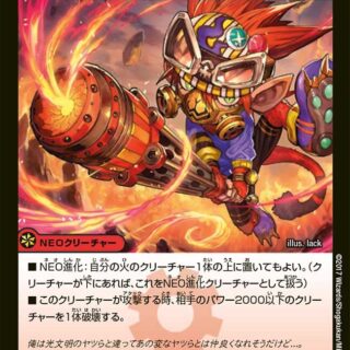 ブロッカー(相手クリーチャーが攻撃する時、このクリーチャーをタップして、その攻撃を阻止してもよい。その後、その相手クリーチャーとバトルする)このクリーチャーは攻撃することができない。このクリーチャーをバトルゾーンに出した時、バトルゾーンにあるクリーチャーを1体選び、持ち主の手札に戻してもよい。