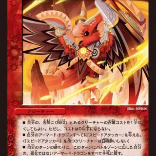 このクリーチャーを召喚する時、自分の手札からコスト7以上のカードを1枚、相手に見せてもよい。そうした場合、このクリーチャーの召喚コストは最大2少なくなる。ただし、コストは1より少なくならない。スレイヤー(このクリーチャーがバトルする時、バトルの後、相手クリーチャーを破壊する)W・ブレイカー(このクリーチャーはシールドを2枚ブレイクする)