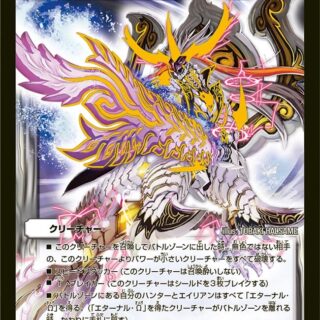 進化-自分のヒューマノイド1体の上に置く。T・ブレイカー(このクリーチャーはシールドを3枚ブレイクする)このクリーチャーが破壊される時、自分の山札の上から1枚目をすべてのプレイヤーに見せる。それがヒューマノイドであれば、このクリーチャーは墓地に置かれるかわりにバトルゾーンにとどまる。このクリーチャーが破壊された時、このクリーチャーの下にあったクリーチャーをすべて、墓地からバトルゾーンに出してもよい。