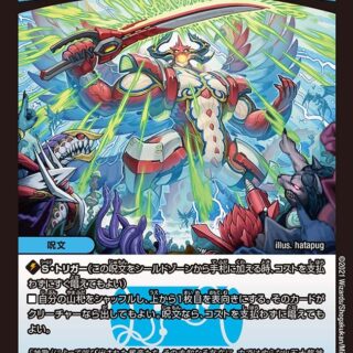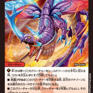 ブロッカー手札進化-水のクリーチャーを1体自分の手札から選び、このクリーチャーをその上に重ねつつバトルゾーンに出す。W・ブレイカー(このクリーチャーはシールドを2枚ブレイクする)このクリーチャーが破壊される時、このクリーチャーの一番上にあるカードだけを墓地に置き、その進化元であったカードをすべて手札に戻す。