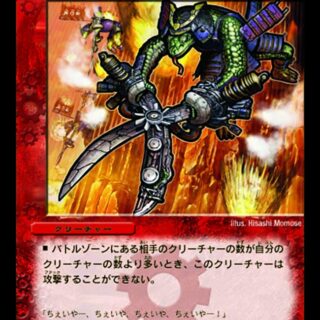 このクリーチャーは、アンタップされているナイト、サムライ、シノビを攻撃できる。このクリーチャーが攻撃できる時、自分の他のクリーチャーを1体破壊してもよい。そうした場合、このターン、このクリーチャーはアンタップされている進化ではないクリーチャーを攻撃できる。 このクリーチャーは、相手プレイヤーを攻撃できない。