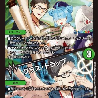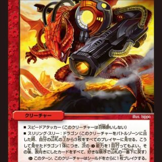 ブロッカー(相手クリーチャーが攻撃する時、このクリーチャーをタップして、その攻撃を阻止してもよい。その後、その相手クリーチャーとバトルする)このクリーチャーは攻撃することができない。自分の進化クリーチャーを召喚した時、クリーチャーを1体、自分の墓地から手札に戻してもよい。