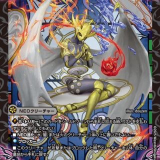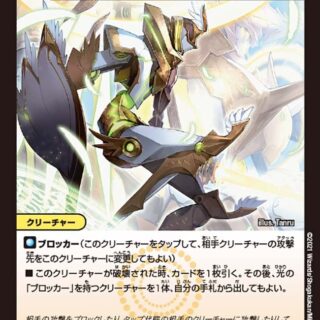 S・トリガーブロッカーこのクリーチャーをバトルゾーンに出した時、バトルゾーンにある相手のクロスギアを1枚選び、持ち主の墓地に置いてもよい。このクリーチャーは、相手プレイヤーを攻撃できない。