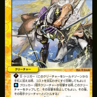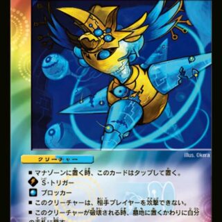 シールド・フォース(このクリーチャーをバトルゾーンに出す時、自分のシールドを1枚選んでもよい。そのシールドがシールドゾーンにある間、このクリーチャーは次の能力を得る)各ターンの終わりに、バトルゾーンにある自分のクリーチャーを1体アンタップする。