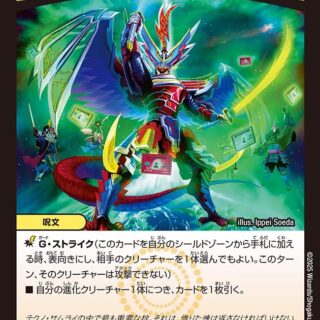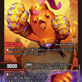 スピードアタッカー(このクリーチャーは召喚酔いしない)O・ドライブ 自然x2 (このクリーチャーを召喚する時、自分のマナゾーンで自然のカードをさらに2枚タップしてもよい。そうした場合、次の能力を得る)このクリーチャーをバトルゾーンに出した時、そのターンの終わりまで、このクリーチャーは「パワーアタッカー+5000」と「W・ブレイカー」を得る。