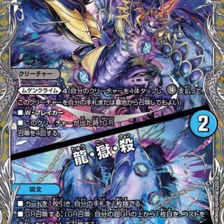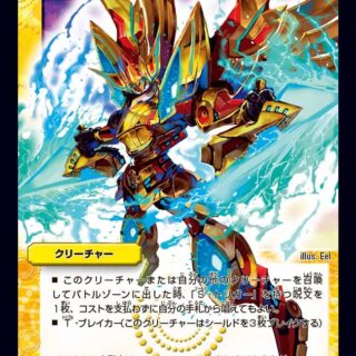 進化-自分のティラノ・ドレイク1体の上に置く。バトルゾーンにある自分のティラノ・ドレイクすべてのパワーは2倍される。自分のティラノ・ドレイクは、パワーが6000以上の時、「W・ブレイカー」を得る。(「W・ブレイカー」を得たクリーチャーは、シールドを2枚ブレイクする)