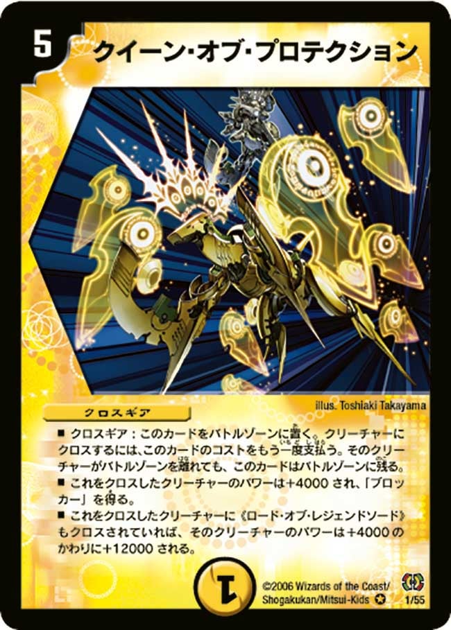 クロスギア:このカードをバトルゾーンに置く。クリーチャーにクロスするには、このカードのコストをもう一度支払う。そのクリーチャーがバトルゾーンを離れても、このカードは バトルゾーンに残る。これをクロスしたクリーチャーのパワーは+4000され、「ブロッカー」を得る。これをクロスしたクリーチャーに 《ロード・オブ・レジェンドソード》もクロスされていれば、そのクリーチャーのパワーは+4000のかわりに+12000される。