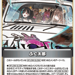 カードタイプ:サポート・イベント・LIMITED レアリティ:U 収録商品:スタートデッキ FLOW GLOW 推し 輪堂千速スタートデッキ FLOW GLOW 推し 虎金妃笑虎 能力テキスト:このカードは、自分の手札がこのカードを含まずに6枚以下でなければ使えない。自分のデッキの上から4枚を見る。その中から、#FLOW GLOWを持つホロメンを好きな枚数公開し、公開したホロメンを手札に加える。そして残ったカードを好きな順でデッキの下に戻す。 イラストレーター名:<br>freng
