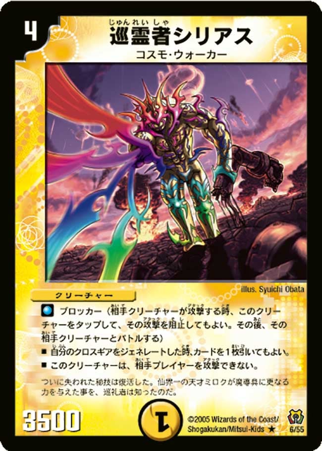 ブロッカー(相手クリーチャーが攻撃する時、このクリーチャーをタップして、その攻撃を阻止してもよい。その後、その相手クリーチャーとバトルする)自分のクロスギアをジェネレートした時、カードを1枚引いてもよい。このクリーチャーは、相手プレイヤーを攻撃できない。