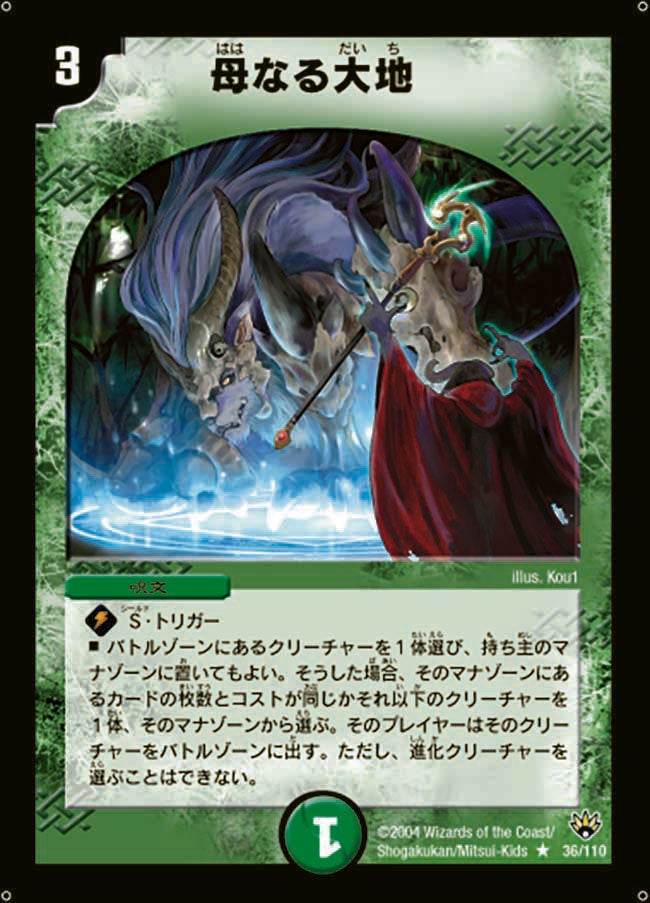 S・トリガーバトルゾーンにあるクリーチャーを1体選び、 持ち主のマナゾーンに置いてもよい。そうした場合、そのマナゾーンにあるカードの枚数とコストが同じかそれ以下の、 進化クリーチャーではないクリーチャーを1体、そのマナゾーンから選ぶ。そのプレイヤーはそのクリーチャーをバトルゾーンに出す。