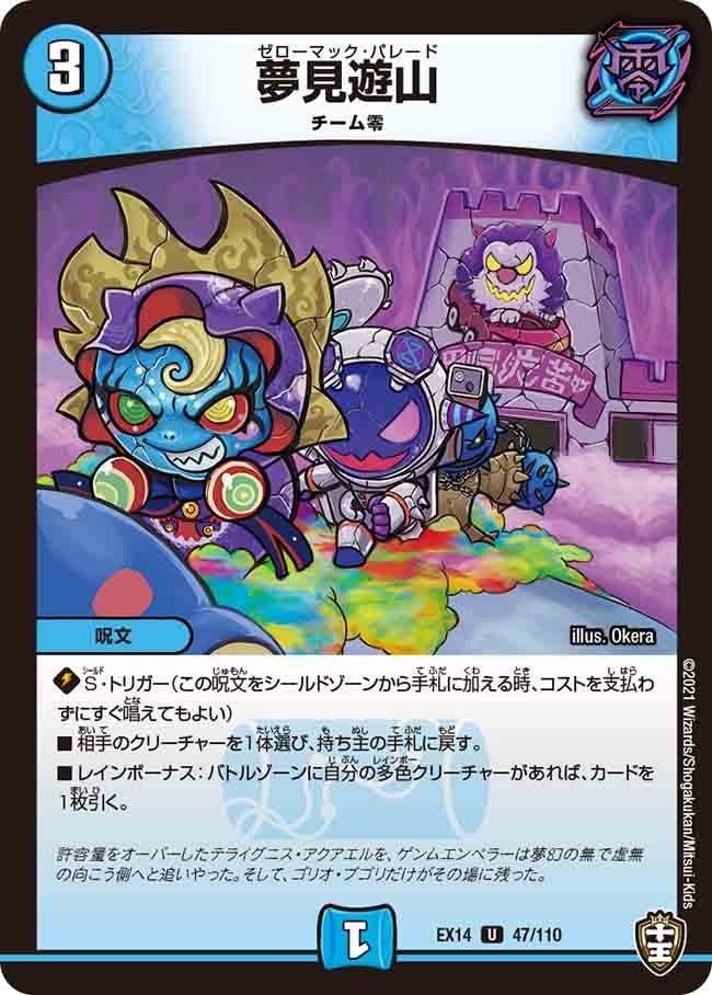 S・トリガー(この呪文をシールドゾーンから手札に加える時、コストを支払わずにすぐ唱えてもよい)相手のクリーチャーを1体選び、持ち主の手札に戻す。レインボーナス:バトルゾーンに自分の多色クリーチャーがあれば、カードを1枚引く。