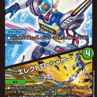 NEO進化:自分の水のクリーチャー1体の上に置いてもよい。(クリーチャーが下にあれば、これをNEO進化クリーチャーとして扱う)W・ブレイカーこのクリーチャーが攻撃する時、自分の手札を1枚裏向きにし、新しいシールドとして、自分のシールドゾーンに置いてもよい。そうしたら、自分のシールドを1つ、手札に加える。ただし、その「S・トリガー」は使えない。