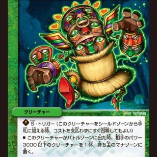 S・トリガー(このクリーチャーをシールドゾーンから手札に加える時、コストを支払わずにすぐ召喚してもよい)ブロッカー(相手クリーチャーが攻撃する時、このクリーチャーをタップして、その攻撃を阻止してもよい。その後、その相手クリーチャーとバトルする)