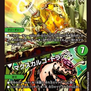 このクリーチャーの召喚コストを、自分のマナゾーンにあるカードタイプ1つにつき7少なくする。ただし、コストは4以下にはならない。ワールド・ブレイカーこのクリーチャーが出た時、自分の山札の上から7枚を表向きにする。その中から、異なるカードタイプを持つカードを好きな数選び、手札に加える。残りを好きな順序で山札の下に置く。相手がカードを実行した時、自分は同じカードタイプのカードを1枚、自分の手札からコストを支払わずに実行してもよい。