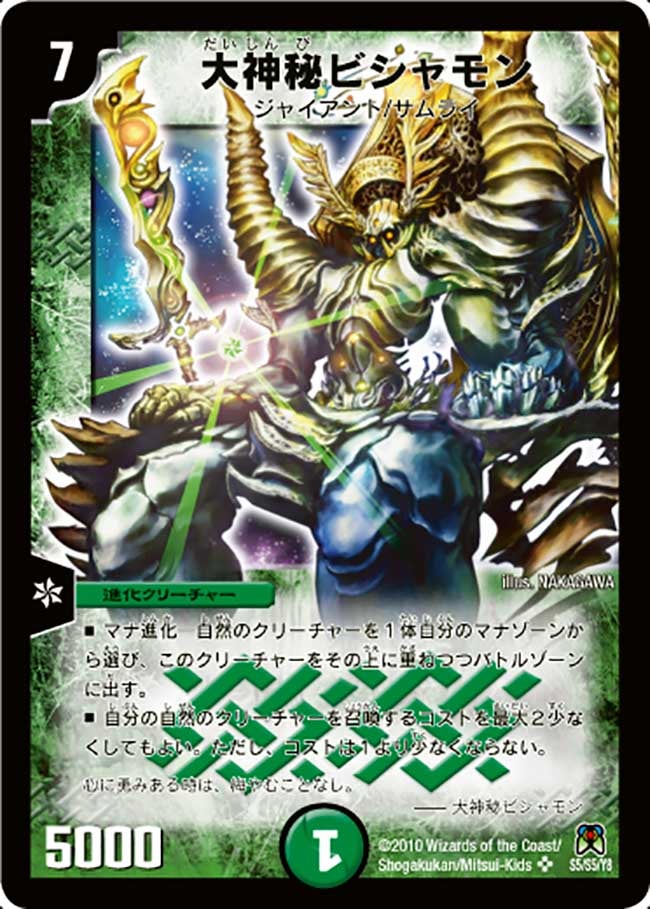 マナ進化-自然のクリーチャーを1体自分のマナゾーンから選び、このクリーチャーをその上に重ねつつバトルゾーンに出す。自分の自然のクリーチャーを召喚するコストを最大2少なくしてもよい。ただし、コストは1より少なくならない。