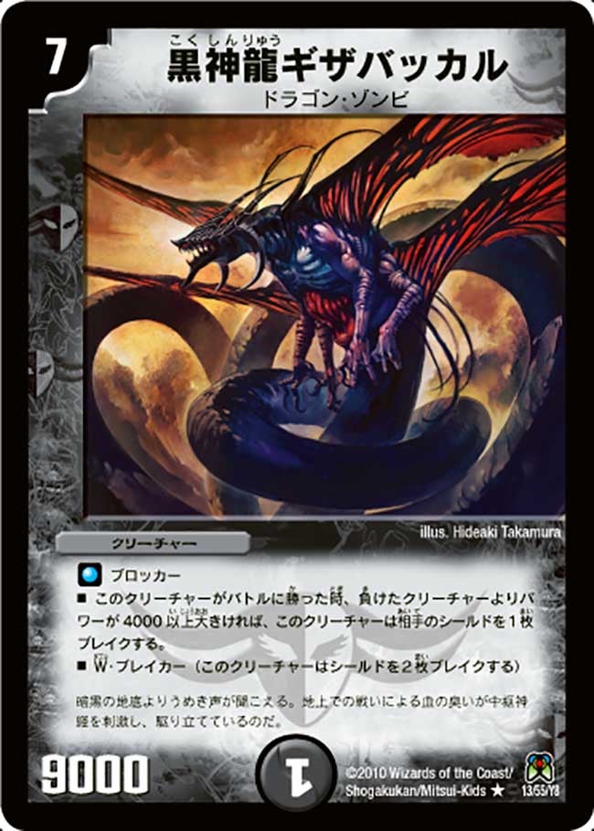 ブロッカーこのクリーチャーがバトルに勝った時、負けたクリーチャーよりパワーが4000以上大きければ、このクリーチャーは相手のシールドを1枚ブレイクする。W・ブレイカー(このクリーチャーはシールドを2枚ブレイクする)