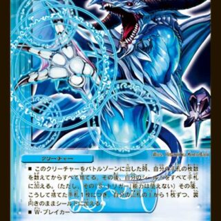 EXライフ(このクリーチャーを出す時、自分の山札の上から1枚目をシールド化する。このクリーチャーが離れる時、かわりにそのシールドを墓地に置く)T・ブレイカー自分のクリーチャーすべてに「スピードアタッカー」を与える。自分のターン中、自分の山札の上から1枚目をいつでも見てもよい。それがクリーチャーなら、召喚してもよい。