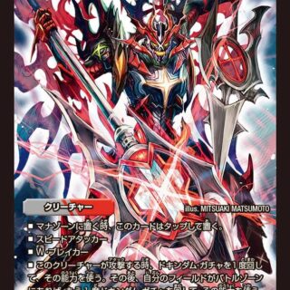 スピードアタッカーパワード・ブレイカーこのクリーチャーのパワーを、自分の墓地にある火のカード1枚につき+3000する。このクリーチャーが出た時、自分の手札をすべて捨て、カードを3枚引いてもよい。こうして捨てた、名前に《ボルシャック》とあるカード1枚につき、相手のパワー6000以下のクリーチャーを1体選び、破壊してもよい。相手のターン中、自分はゲームに負けない。このクリーチャーが破壊される時、かわりに名前に《ボルシャック》とあるカードを3枚、自分のマナゾーンから墓地に置いてもよい。