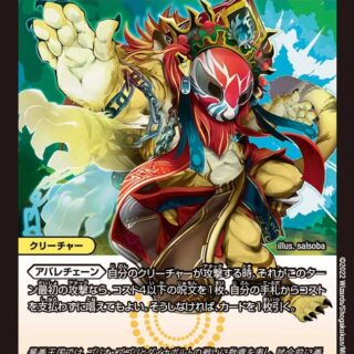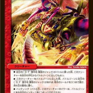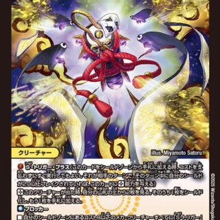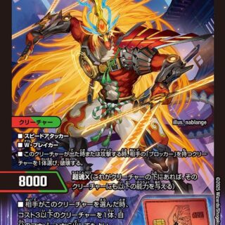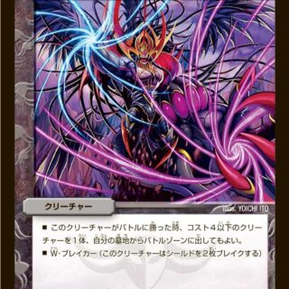 スピードアタッカーこのクリーチャーが出た時、クリーチャーを1体、自分の墓地から手札に戻してもよい。超魂X(これがクリーチャーの下にあれば、そのクリーチャーにも以下の能力を与える)このクリーチャーが攻撃する時、このクリーチャーの下にあるカードを1枚墓地に置いてもよい。そうしたら、相手のシールドを1つ選び、持ち主の墓地に置く。