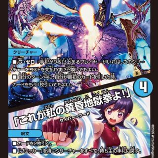 S・トリガーブロッカー(このクリーチャーをタップして、相手クリーチャーの攻撃先をこのクリーチャーに変更してもよい)このクリーチャーが出た時、自分の山札の上から1枚目をタップして自分のマナゾーンに置き、その後、ドラゴン・クリーチャーを1体、自分のマナゾーンから手札に戻す。そのドラゴン以下のコストを持つ相手のクリーチャーを1体選び、持ち主の手札に戻す。