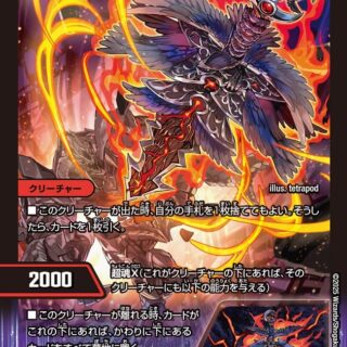 {GS} G・ストライク(このカードを自分のシールドゾーンから手札に加える時、表向きにし、相手のクリーチャーを1体選んでもよい。このターン、そのクリーチャーは攻撃できない)ブロッカー(このクリーチャーをタップして、相手クリーチャーの攻撃先をこのクリーチャーに変更してもよい)超魂X(これがクリーチャーの下にあれば、そのクリーチャーにも以下の能力を与える)自分のターンの終わりに、このクリーチャーにカードが3枚以上含まれていれば、カードを2枚引いてもよい。