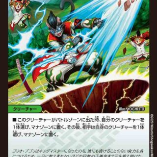 S・トリガー(このカードをシールドゾーンから手札に加える時、コストを支払わずにすぐ実行してもよい)自分と相手のクリーチャーを1体ずつ選んでもよい。その2体をバトルさせる。自分の山札の上から1枚をマナゾーンに置く。