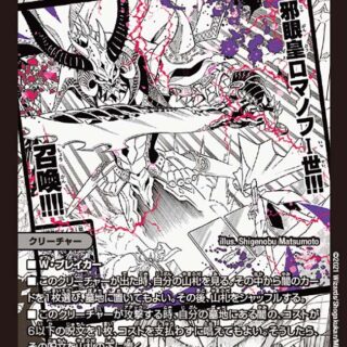 EXライフ(このクリーチャーを出す時、自分の山札の上から1枚目をシールド化する。このクリーチャーが離れる時、かわりにそのシールドを墓地に置く)ブロッカーT・ブレイカーこのクリーチャーが出た時、自分の墓地のカードをすべて、タップしてマナゾーンに置いてもよい。各ターンに一度、クリーチャーを1体、自分のマナゾーンから召喚してもよい。それがディスタスならコストを支払わずに召喚する。