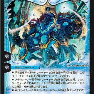 NEO進化:闇、火、または自然のクリーチャー1体の上に置いてもよい。NEO進化クリーチャーとして召喚するなら、このクリーチャーの召喚コストを2少なくする。W・ブレイカーこのクリーチャーが出た時、自分の手札を1枚捨て、その後、自分の山札の上から2枚を表向きにする。こうして表向きにしたカードがすべてクリーチャーで、コストの合計がその捨てたカードのコスト以下なら、表向きにした2体を出す。そうでなければ、表向きにした2枚を手札に加える。
