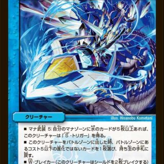 G-NEO進化:光、水、または自然のクリーチャー1体の上に置いてもよい。(カードが下にあれば、NEO進化クリーチャーとして扱い、離れる時、かわりに下のカードすべてが離れる)ブロッカーW・ブレイカー各ターンの終わりに、自分の進化クリーチャーをすべてアンタップする。相手のクリーチャーが召喚以外の方法で出た時、それを持ち主の山札の下に置く。
