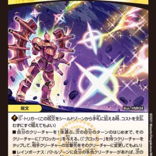 S・トリガー(このカードをシールドゾーンから手札に加える時、コストを支払わずにすぐ実行してもよい)NEO進化:光、火、または自然のクリーチャー1体の上に置いてもよい。(カードが下にあれば、これをNEO進化クリーチャーとして扱う)W・ブレイカー(このクリーチャーはシールドを2つブレイクする)このクリーチャーが、進化して出た時、または進化元になる時、自分の山札の上から1枚をマナゾーンに置いてもよい。