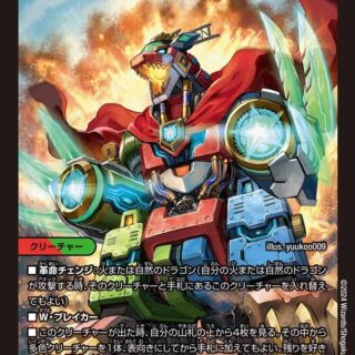 S・トリガー自分の山札の上から3枚を表向きにする。その中から光のクリーチャー、自然のクリーチャーを1体ずつ手札に加えてもよい。残りを好きな順序で山札の下に置く。その後、光または自然の、コスト3以下のクリーチャーを1体、自分の手札から出してもよい。次の自分のターンのはじめまで、そのクリーチャーに「ブロッカー」を与える。