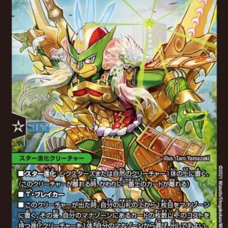 このクリーチャーが出た時、自分の山札の上から1枚目をタップしてマナゾーンに置く。シビルカウント 5:自分の、自然のクリーチャーまたは自然のタマシードが合計5つ以上あれば、自分のマナゾーンにあるカードのマナの数字を2にする。