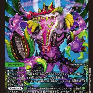 マッハファイター(このクリーチャーは、バトルゾーンに出たターンの間、タップまたはアンタップしているクリーチャーを攻撃できる)このクリーチャーがバトルに勝った時、自分の山札の上から3枚を表向きにする。その中からクリーチャーを1体、自分の手札に加えてもよい。残りをマナゾーンに置く。T・ブレイカー