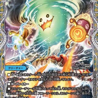 進化:水のクリーチャー1体の上に置く。S級侵略 [宇宙]:水のコマンド(自分の水のコマンドが攻撃する時、バトルゾーンまたは自分の手札にあるこのカードをその上に重ねてもよい)W・ブレイカーこのクリーチャーはブロックされない。このクリーチャーがシールドをブレイクする時、かわりに相手の山札の上から2枚を、持ち主の墓地に置く。