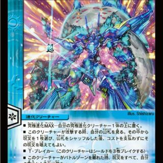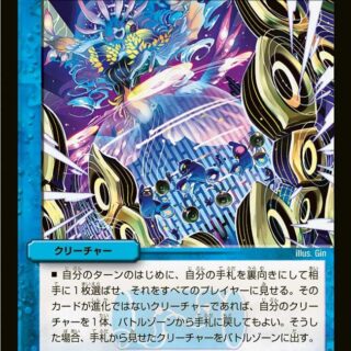 ブロッカーW・ブレイカーこのクリーチャーが出た時または攻撃する時、カードを1枚引く。その後、自分の手札を1枚、シールド化してもよい。ハイパー化:自分の他のクリーチャーを1体タップする。(自分のメインステップ中に、ハイパーモードを解放できる。ハイパーモードは次の自分のターンのはじめまで続く)