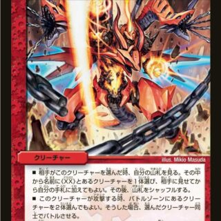 ブロッカーW・ブレイカーこのクリーチャーが出た時、自分の山札の上から2枚を見る。そのうちの1枚をシールド化し、もう1枚をマナゾーンに置く。ハイパー化:自分の他のクリーチャーを1体タップする。(自分のメインステップ中に、ハイパーモードを解放できる。ハイパーモードは次の自分のターンのはじめまで続く)