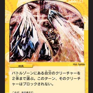 S・トリガーこのクリーチャーが出た時、自分よりシールドの数が多い相手プレイヤー1人につき、自分の山札の上から1枚目をシールド化する。自分のシールドがブレイクされる時、かわりに自分のクリーチャーを1体タップしてもよい。
