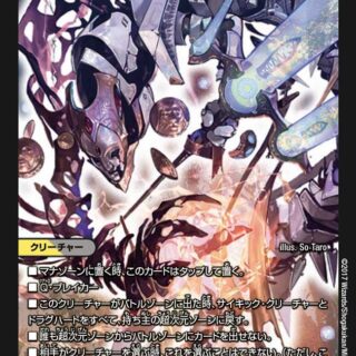 T・ブレイカーこのクリーチャーが出た時、バトルゾーンまたはマナゾーンに自分のジョーカーズが合計4枚以上あれば、相手はバトルゾーン、マナゾーン、手札から自身のカードを1枚ずつ選び、好きな順序で山札の下に置く。その後、自分はカードを3枚引く。