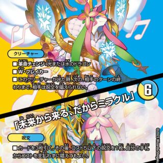ジャストダイバー(このクリーチャーが出た時、次の自分のターンのはじめまで、このクリーチャーは相手に選ばれず、攻撃されない)T・ブレイカー自分のドラゴンが出た時、カードを5枚まで引く。相手は、自分の手札の枚数より小さいコストの呪文を唱えられない。
