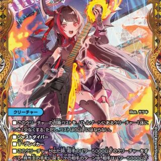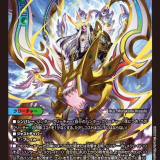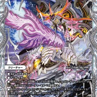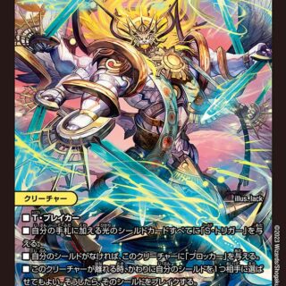 ブロッカーT・ブレイカーこのクリーチャーが召喚によって出た時、自分の山札の上から1枚目をシールド化し、その後、自分のシールドを1つ相手に選ばせる。そのシールドをブレイクしてもよい。自分のシールドゾーンにあるカードすべてに「S・トリガー」を与える。エターナル・Ω(このクリーチャーが離れる時、かわりに手札に戻す)
