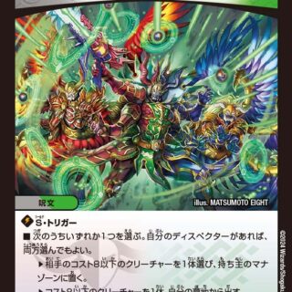 革命0:このクリーチャーがバトルゾーンに出た時、自分のシールドが0枚なら、自分の山札の上から2枚を裏向きのまま、それぞれ新しいシールドとして自分のシールドゾーンに置いてもよい。革命2:自分のシールドが2枚以下なら、自分の手札に加えるシールドカードすべてに「S・トリガー」を与える。このクリーチャーが破壊される時、墓地に置くかわりにマナゾーンに置く。