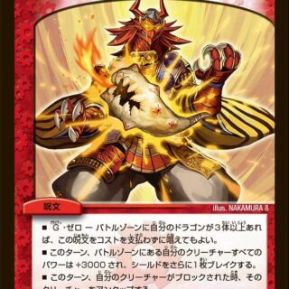 EXライフ(このクリーチャーを出す時、自分の山札の上から1枚目をシールド化する。このクリーチャーが離れる時、かわりにそのシールドを墓地に置く)W・ブレイカーこのクリーチャーが出た時、自分と相手のクリーチャーを1体ずつ選び、その2体をバトルさせる。バトル中、このクリーチャーのパワーを+8000する。