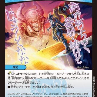 S・トリガー(このクリーチャーをシールドゾーンから手札に加える時、コストを支払わずにすぐ召喚してもよい)W・ブレイカー(このクリーチャーはシールドを2つブレイクする)このクリーチャーが出た時、相手のクリーチャーを1体選んでもよい。その選んだクリーチャーとこのクリーチャーをバトルさせる。相手のターン中にこのクリーチャーが出た時、そのターンの終わりにこのクリーチャーを自分の山札の下に置く。