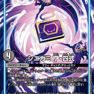 ムゲンクライム 4(自分のクリーチャーを4体タップし、 [dd04]支払って、このクリーチャーを自分の手札または墓地から召喚してもよい)W・ブレイカーこのクリーチャーが出た時、GR召喚を4回する。