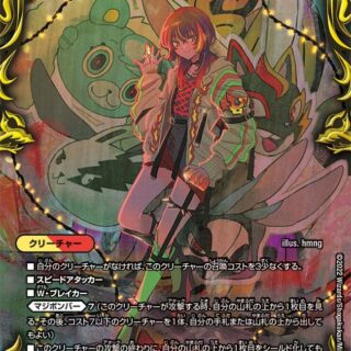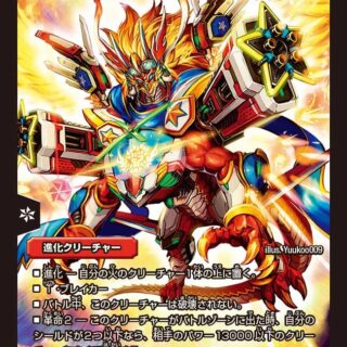 進化:水、闇、または自然いずれかのクリーチャー1体の上に置く。SSS級侵略 [天災]:水、闇、または自然のコマンド(自分の水、闇、または自然のコマンドが攻撃する時、バトルゾーン、自分の手札、墓地、マナゾーンにあるこのカードをその上に重ねてもよい)W・ブレイカーこのクリーチャーを別のクリーチャーの上に重ねた時、相手のクリーチャーを1体選び、持ち主の墓地かマナゾーンに置く、または手札に戻す。